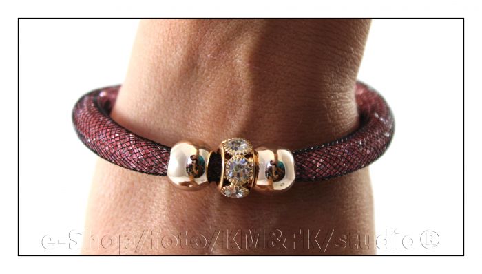 Štýlový náramok s uzatváraním na magnetický patent. Krásny náramok s kamienkami v čiernej sieťovine a z ozdobnými zlato kovovými aplikáciami.