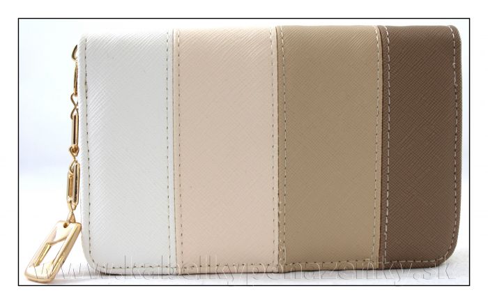 Dámska peňaženka na zips s ozdobnými pásmi prešívaná. Interiér peňaženky má tri komory a jeden zipsový priestor pre drobné kovové mince. Po stranách v interiéry má peňaženky osem prepážok pre kreditné karty.