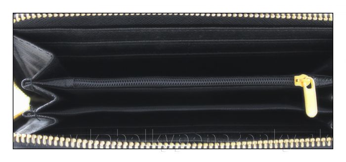 Dámska peňaženka na zips s ozdobným pásom strede peňaženky. Interiér peňaženky má tri komory a jeden priestor pre drobné kovové mince uzatváraný na zips. Peňaženka z vnútra vybavená postrannými štyrmi prepážkami pre kreditné karty.